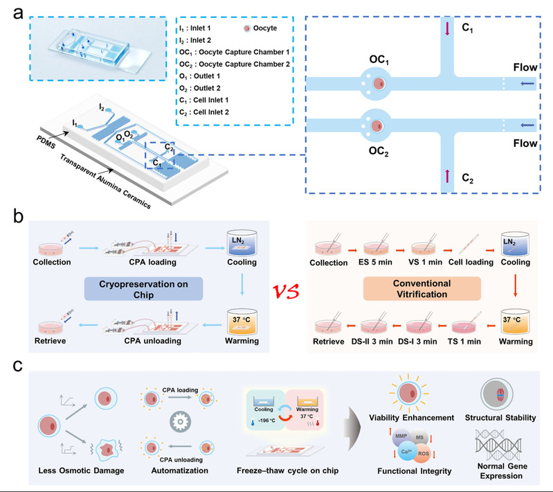 卵母细胞冷冻保存是肿瘤患者、高龄女性生育力保护的关键手段。传统玻璃化冷冻步骤繁琐、操作变异性高,高浓度保护剂易引发严重渗透损伤与细胞毒性,导致存活率与发育潜力偏低。针对这一临床痛点,研究团队创新采用高导热透明氧化铝陶瓷作为芯片基底,结合蛇形混合流道与微柱捕获结构,构建半自动化、标准化的片上冷冻平台。