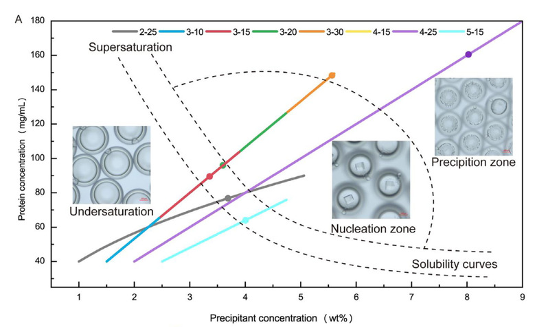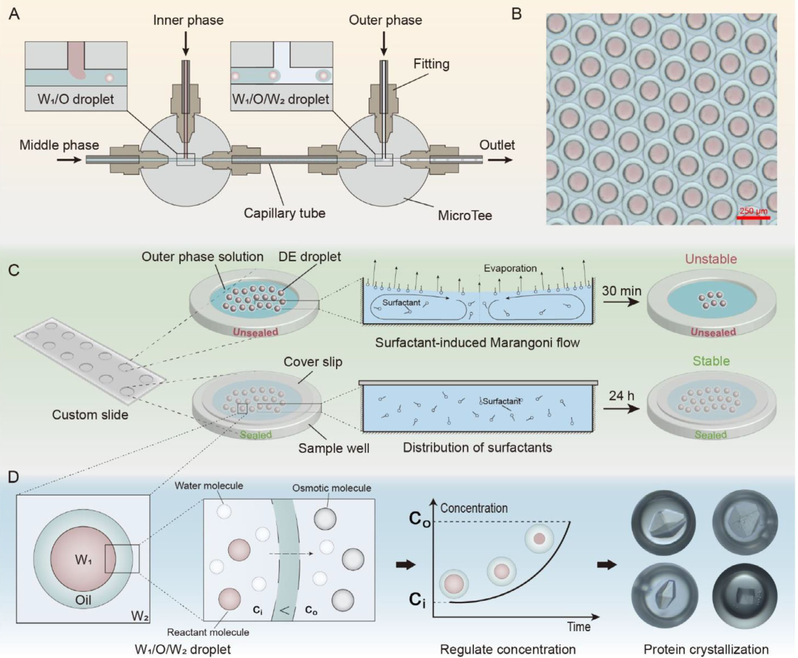 蛋白质结晶是结构生物学中的关键瓶颈,传统方法存在样品消耗大、周期长、可重复性差等问题。该研究提出的DCCV平台,采用半透性双乳液滴作为微反应器,利用内外水相的渗透压梯度,实现液滴形成后溶质浓度的动态调控。结合基于深度学习的自动液滴分析系统,实现了高通量、无标记的结晶过程实时监测。